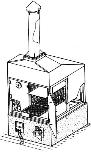 Système de chauffe: un brûleur torche (puissance moyenne: 40 kW ) incorporé dans un foyer avec pare-flamme