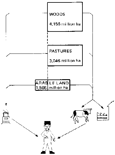 An inventory of nutrient sources is rather illuminating (see Figure 1). There are approximately 9,000 million ha of land in the world. Close to 50 per cent of this area consists of forests and shrub lands. Another 35 per cent is pasture and grassland, and 15 per cent is arable land. Of the produce grown on arable land, by far the major part is discarded as residue. This means that approximately 95 per cent of the land areas mentioned in Figure 1 could provide a source of nutrients yet untapped in the sense that their agricultural residues are not being utilized directly for human consumption.
