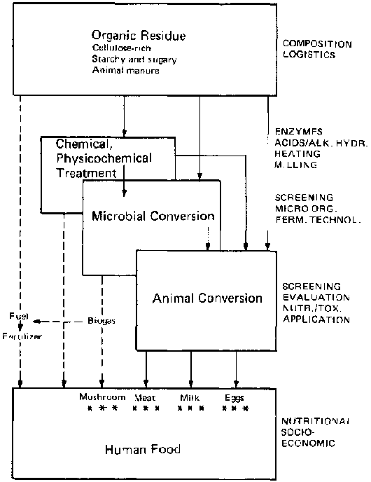 Figure 3 shows the pathways for the bioconversion of residues into food. In the upper box, cellulose-rich, starchy and sugary residues, and animal manure are represented. The lower box shows the goal of bioconversion systems: food for man. In most cases this will be in the form of meat, milk, or eggs.