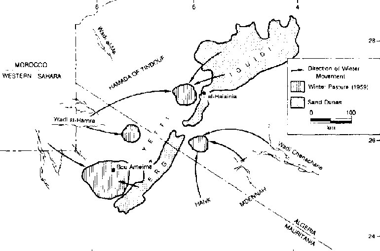In winter, the various Rigaibat groups can be found around permanent watering points or shallow wells in Wadi al-Saquia al-Hamra, Wadi al-Ma, and Wadi Chenachane, along the flanks of the Zemmour Labyad and al-Hank ridges, or in especially favored hollows among the sand dunes of the Erg Iguidi. (12) During the summer, the friqs are concentrated in the wadi bottoms of the ergs, and the regs and hamadas are almost totally devoid of occupation. The distribution of herds and friqs remains unchanged until the first rains begin.