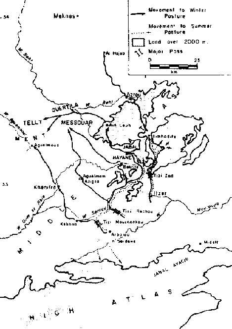 In 1959, the most favored areas were around the wells of al-Haiaina and Bou Ameima. Nevertheless, not all friqs went to the summer pastures in Yetti. A close check of the number of friqs present in the winter wadis (as shown in figure 1-1) indicates that nearly half failed to leave their winter locations. Admittedly, 1959 was a somewhat humid year, thus making local resources more attractive and perhaps reducing the desirability of moving. Also, the poor families, unwilling to face the potential risks involved in shifting their flocks to relatively unfamiliar territory, perhaps remained behind, while those possessing larger herds and greater ability to resist sudden catastrophe risked the migration. This points out the variation in patterns of movement that can be found within one tribe. The limited circulation of the poorer friqs around permanent water supplies and along the course of the wadi beds resembles the limited movement of the Kel Tamasheq.