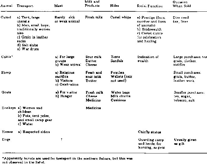 Further north, the mixture of pastoral and agricultural forms becomes more complex. Some tribes are strictly camel herders, with little or no interest in agriculture. For example, the Ahel Noh spend the cool, dry season in the southern part of their area, the dry, hot season in an intermediate zone of sand dunes, and the rainy season on the edge of the Dar in the north. (22) The location of the dry, hotseason pastures in a zone intermediate between the pastures of the other two seasons is quite unusual, but actually represents merely an adaptation to peculiar locally favorable resources - in this case, the water resources collected at shallow depths beneath the dunes.