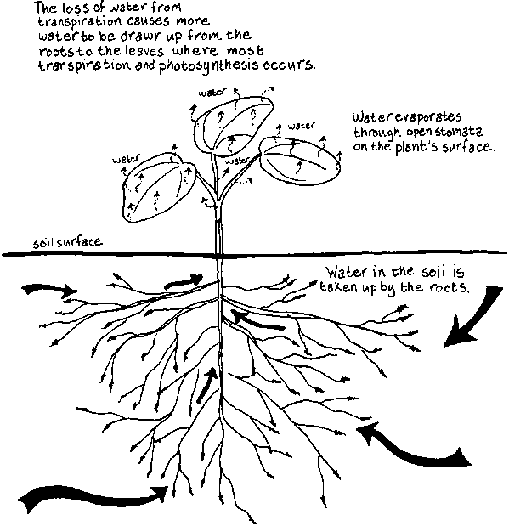 Transpiration is important for two reasons: as just described, it provides the pull that keeps water and nutrients moving up through the plant from the roots (Figure 5.7), and, under hot, dry conditions transpiration cools the plant the same way evaporation cools our skin when we sweat. About 90% of all water absorbed by plant roots is released in transpiration. Under stressful (hot, dry) conditions, the amount of water needed by the plant, and thus the amount released in transpiration, increases.