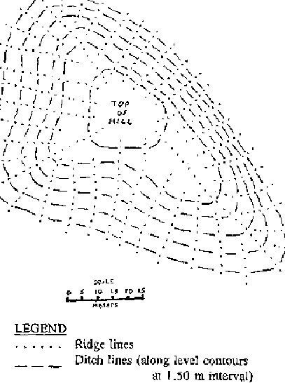 "The accompanying contour map of a section of hilly terrain illustrates the scheme. The level contours, shown by dashed lines, are laid out so that there is a 1.5 meter difference in elevation. This has been found to be a satisfactory spacing on most slopes for intercepting and temporarily holding runoff from heavy rains. In practice there is no need to make a map. A few level lines are staked out on the ground, starting just below the hill summit, at the stated 1.5 meter vertical elevation difference between them. A small inexpensive line-level hung onto a nylon string provides an easy way of laying out these level lines. With taller stakes readily visible, one chooses and marks the ridge lines roughly perpendicular to the direction of the trenches and spaced six or seven meters apart. This rather close spacing eliminates the necessity of any hauling of excavated ditch material, as all can be thrown by shovel from trenches to ridges. The ridges are represented on our contour map by the dotted lines. Trenches should be at least 30 cm in depth, and a minimum of 60 cm wide, with a level bottom. Of course, where the ridges are to be the trenches need not be dug out. Thus the trenches consist of short sections of ditch. Very careful leveling is less important than it would be for a long extended ditch.