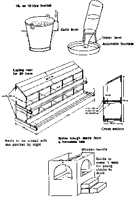 1 pole, 3.5 metres 70 laths for the roof 17 mats Hay or straw for thatching Poultry wire netting, 22 metres One roll of wire Fittings for the door 300 mud bricks Sand Nails, 6 kilogrammes Inside all poultry houses put feeding troughs and drinking founts.