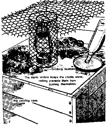 To protect the chicks from predatory animals put them in a big wooden case or In a big basket. See the picture on page 45.