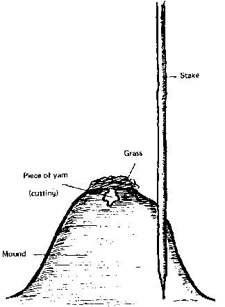 The bulbils, pieces of tuber or small tubers are planted in the top of the mound at a depth of 5 to 10 centimetres, and covered with soil. When there is too much sun or the light is too strong, cover the mound with grass, so that the sun will not dry out the young plant and the rain will not wash away the soil and the tubers
