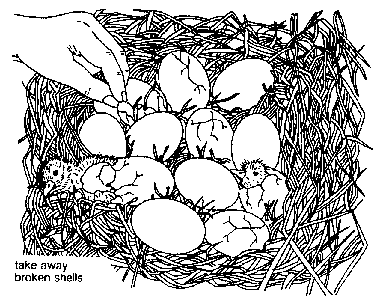157. As the baby ducks hatch, take away the pieces of broken shell from the nest.