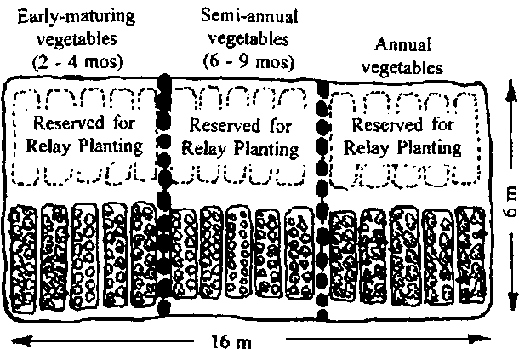7. Plant the remaining 1/3 to annual vegetables. Set aside the last section for planting year-round vegetables like lima beans, upland swamp cabbage, basella, pigeon pea, etc. Reserve In of the section for relay planting.