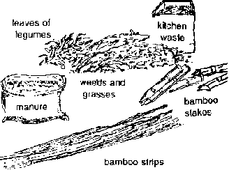 · home organic garbage, farm and garden wastes, leaves of ipil-ipil, kakawate, rensoni and/or Flemingia (if available)