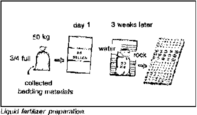 This method is described in detail as a separate topic in another section. (See Liquid Fertilizer from Leguminous Trees, pages 136-137). In general, it involves taking legume or other fresh leaves and placing them in a jute sack or the like. The sack is soaked in water for 10 days. The tea is used to water high-value crops (like sweet potato, eggplant, cabbage) while the partially decomposed leaves from the tea bag can be used as a mulch or compost material.