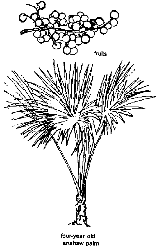 Anahaw is often planted as an ornamental plant for indoor and outdoor as it remains bright green even in very dry environment. The trunk is hard, strong and durable. It can be split into strips for flooring, siding and even handles of tools. It is commonly used as posts, piles in fishpen and poles. The buds and shoots are cooked as a vegetable. Mature leaves are used as roofing of houses in rural areas. The leaves last up to 15 years when properly used. The young leaves are made into raincoats, hats, fans and containers for rice, charcoal, etc.