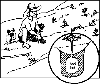 You can also follow the contour when outplanting although it is not so imperative. Be sure not to break the earth-ball when setting the seedling into the planting hole. The upper part of the earth-ball should be level or slightly deeper than the edge of the hole. Soil is filled into the spaces and tamped firmly all around.