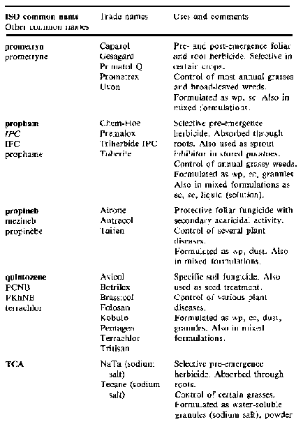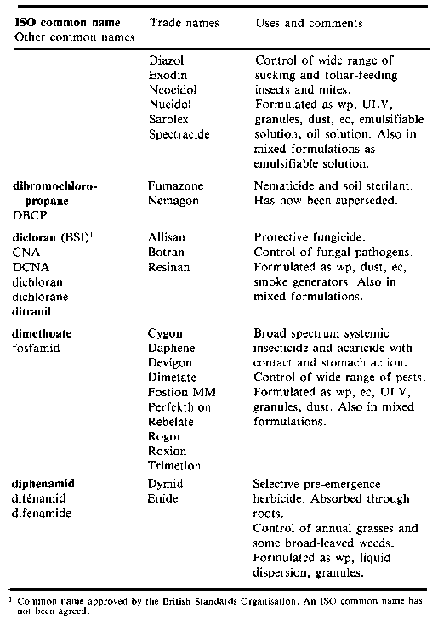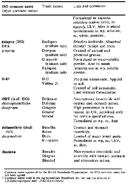 The word pesticides refers to chemicals used to combat insects, arachnids, nematodes, diseases and weeds. The following table lists the International Organization for Standardization common names of pesticides mentioned in the text, and other common names, along with their more commonly known trade names and notes on their use. The use of italics for a common name denotes that it is no longer used, or in the case of a trade name, that it is no longer manufactured.