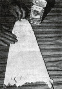 Stretch the skins on a V-shaped, 1.50 m long piece of No. 9 galvanized iron wire covered with plastic to prevent rusting. The fur should be inside and the flesh facing out. When this is done, apply coconut or olive oil thinly and evenly on the skins (see oiling formula below)(Fig. 39). If either olive or coconut oil is not available, use 100 cc of any type that is procurable and will not turn rancid. If only one of the recommended is available, use 100 cc for the oiling process, To dry, hang the skins in the shaded place not under the direct sunlight (Fig. 40).