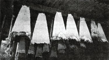 First, soak the skins in highly concentrated salt solution for one night. The next day, squeeze the water from the skin but again do not twist. Salt thoroughly the flesh side of the skins (1 k salt per pelt, Fig. 37). From time to time examine the skins to see if any portion is not covered with the salt. Rub more salt on any uncovered portion. Poor salting will result in the later dropping off of the fur.