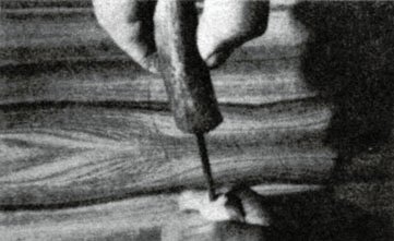5. Spoon just enough glue with the pointed stick into the drilled hole (Fig. 44).