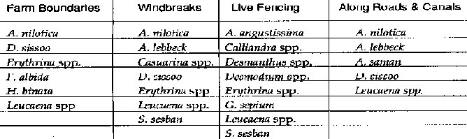 In the selection of NFT species for revegetation, emphasis must be given to the ability to establish and survive in difficult, deteriorated habitats. Many species have been tried on rocky, gravelly and generally degraded lands. Those that have survived best under the most harsh conditions in India include Acacia tortilis, Albizia amara, and Hardwickia binata. Some typical planting arrangements and production levels are shown in Table 3.