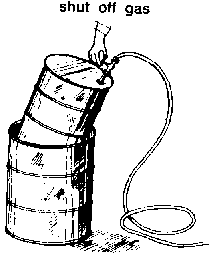 114. Shut off the gas at the small drum and take off the burner. Empty out any water that is in the gas line or in the burner. Then put the burner back, turn on the gas and light the burner again.