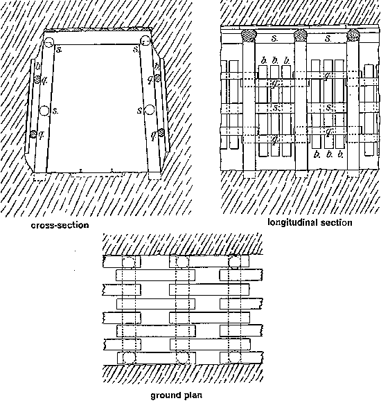 The Polish timbering method is characterized by a loose laying of the roof bar on top of the two grooved props. This method cannot counter shearing forces (lateral compression).