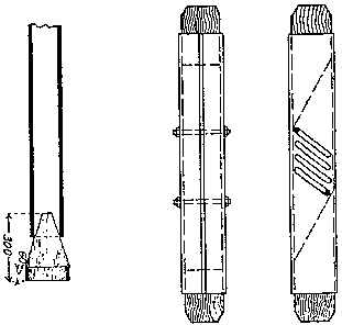 Besides metallic bolts, wooden slot-and-wedge anchors were applied in the U.S.A. mainly in places with soft hanging such as argillaceous and quarzitic shalestone. Its dimensions were 5 cm, 125 cm length, 6 × 6 cm head, turned on a lathe with fresh, wet pine or spruce wood, two wedges 1 7/8 × 1 × 16" and one 30" in anchor plate. The cost approx. 0.5 US$/plece. The advantages were, high retaining force in loose adjoining rock, the possible production at the mine site, and high corrosion resistance. Such anchors have been produced locally with output of some 500 pieces/man-shift and setting capacity of some 100 pieces/ms.
