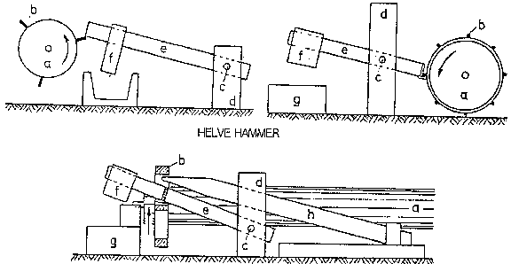 a=AXLE, b=CATCHERS, c=STAMP LEVER JOINT, d=STAMP LEVEL JOINT HOLDER, e=STAMP LEVER, f=STAMP, g=ANVIL, h=OVERHEAD STABILIZER