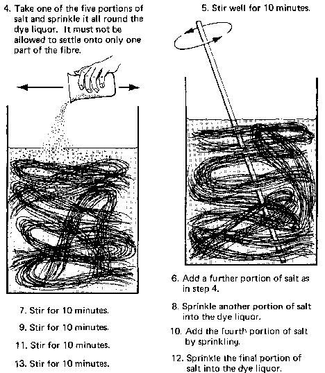 The dyebath will now be at about 50°C-the maximum temperature at which dyeing should be started.