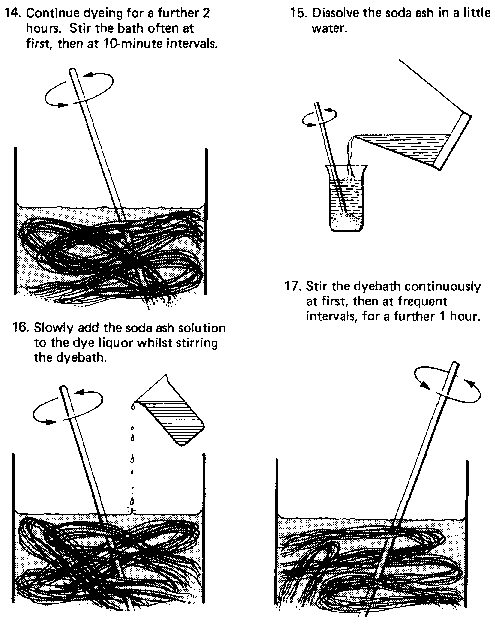 14. Stir the dyebath well then bring it to the boil with occasional stirring. Boil it for a few minutes to dissolve the dye.