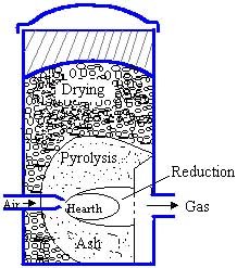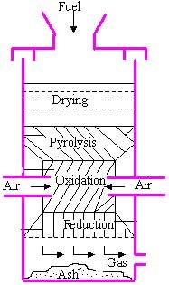 An updraft gasifier has clearly defined zones for partial combustion, reduction, and pyrolysis. Air is introduced at the bottom and act as countercurrent to fuel flow. The gas is drawn at higher location. The updraft gasifier achieves the highest efficiency as the hot gas passes through fuel bed and leaves the gasifier at low temperature. The sensible heat given by gas is used to preheat and dry fuel. Disadvantages of updraft gas producer are excessive amount of tar in raw gas and poor loading capability. Hence it is not suitable for running vehicle. |
