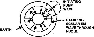 The nonlinear Earth medium acts as a modulator, causing the two opposite waves to mutually modulate each other and lock together as a single wave. This resulting scalar EM wave is a resonant, standing spherical wave with zero E and B electromagnetic force field resultants. This standing scalar EM wave is set up throughout the spherical Earth medium (Figure 3). This wave has zero-resultant E and B fields, but consists of oscillations in the stress energy density of the vacuum itself. It is, therefore, a gravitational wave and travels through the atomic nuclei of the Earth as its transmission medium, rather than through the atomic orbital electron shells (8).