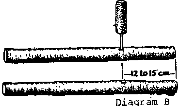 First, a hole is made near each end of the two split pieces of wood using the drill. Drill the holes wide enough for a 6/½ cm nail to be hammered through without splitting the wood. The holes should be 3 to 5 cm from the ends of the sticks. This procedure is shown in Diagram A. Next, drill one hole in each of two of the other pieces of wood. Each hole is 12 to 15 cm from one end of the wood. This procedure is shown in Diagram B.