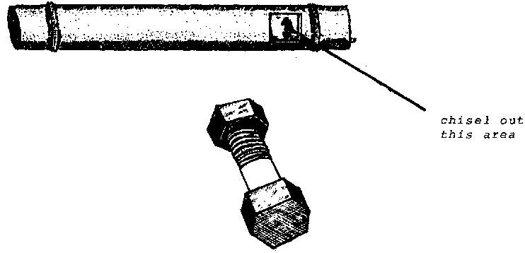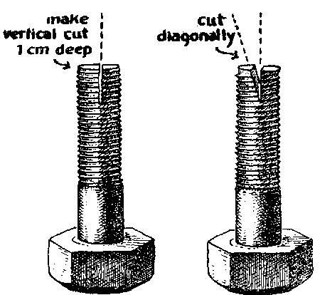 In cutting the bolt with the hacksaw, first make a vertical cut about 1 cm deep. Then cut between 2 and 3 mm away from the first cut. (mm - millimeter; a millimeter is one tenth of a centimeter.) This second cut should be a diagonal one. It is important that the cut be made no larger than 3 mm. If the cut is wider, it will be difficult to remove any nails.
