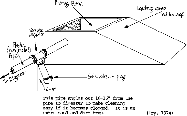 In Diagram 9 the level of the bottom of the pipe to the digester is one-half to one inch above the floor of the mixing basin in order to reduce the amount of dirt getting into the digester. A valve or plug should be at the floor level of the basin, at the end of a channel that crosses the middle of the basin from one side to the other. This dirt will make a profitable addition to a compost pile.