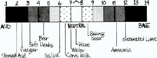To measure the acid or base condition of anything, the symbol "pH" is used. The liquid in your stomach, vinegar, Coke, and beer are all acid. Ammonia and lime are base. A neutral solution has a pH of 7.0, an acid solution has a pH below 7.0, and a base (also called alkaline) solution has a pH above 7.0. The acid-base balance has a very big effect on all living things. The maintenance of a stable pH is very important to all life. Animals cannot eat food, nor can plants live in soil that is too acid or too base. Both strong acids and strong bases can destroy anything they come in contact with (see Diagram 10).