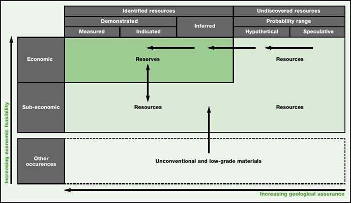 In this classification system, resources are defined as concentrations of naturally occurring solid, liquid, or gaseous material in or on the Earths crust in such form that economic extraction is potentially feasible. The geologic dimension is divided into identified and undiscovered resources. Identified resources are deposits that have known location, grade, quality, and quantity or that can be estimated from geologic evidence. Identified resources are further subdivided into demonstrated (measured plus indicated) and inferred resources, to reflect varying degrees of geological assurance. Reserves are identified resources that are economically recoverable at the time of assessment (see the British Petroleum definition, above).