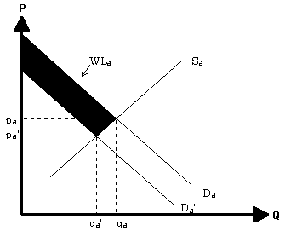 The welfare effect in the used-clothes market (Diagram 2u above) is clearly positive: Consumer surplus increases by the shaded area, and there is thus a welfare gain labeled WGu. The domestic clothing industry (Diagram 2d above) faces a fall in demand, which leads to a lowering of price from pd to pd', and a smaller quantity sold, qd' rather than qd. This implies a reduction in consumer surplus, and a reduction in producer surplus as well, for a net welfare loss equal to the shaded area labeled WLd. In the imported new-clothes sector (Diagram 2i above), there is also a fall in demand, and therefore also a fall in consumer surplus of the shaded area, a welfare loss labeled WLi. Finally, the other goods and services sector may absorb the production factors (labor, capital, etc.) released by the domestic clothing industry, thereby increasing production and generating some increase in consumer as well as producer surplus (WGo, not shown).