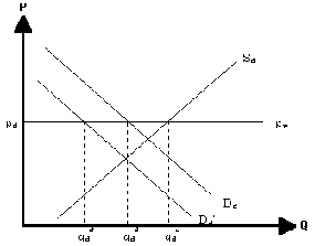 For simplicity in the discussion of subsidized imports of used-clothes, we have so far assumed that domestically-produced clothes are non-tradable, that is, that the domestic clothing industry does not export. How would the argument change if domestically-produced clothes were exported, and prices were thus set on the world market? Diagrams 2i and 2u (for imported new and used clothes, respectively) would be unchanged, of course, but Diagram 2d (domestic new clothes) would have to be replaced by Diagram 3d, below. Here, domestic demand for domestically-produced clothes is Dd, and the quantity purchased domestically at price pd is qdd. However, we now assume that we have comparative advantages in this sector, and are able to produce a total of qdt, given the world market price pw = pd. The difference between domestic supply and domestic demand (qdt-qdd) is then sold on the international market.