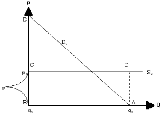 Analytically, assume we have the situation as depicted in Diagram 4u, below: There is a demand curve for used clothes, but initially no supply. However, assume now that we were to give such a large freight subsidy that prices in the market go to zero: Then the consumer surplus gain would equal the whole triangle ABE. The cost is again equal to the rectangle ABCD, but now this may be considerably less than the gain, though this, of course, depends on the costs of transporting the goods to the country in question. The difference between this and the former case (Diagram 2u in the previous chapter) is that now there is no initial commercial supply of used clothes at all. Before, the subsidy only changed the amount of consumer surplus; now the subsidy accounts for all of it, because the existence of any supply at all is conditional upon it. Since we assume that this is a crisis situation where goods would not be available if they were not delivered by the donor, the money transfer option would not exist as an effective alternative. Thus, in such a case, the subsidy would be warranted, basically for humanitarian reasons.