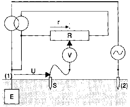 The sensing probe S is placed at the position where we need to know the voltage drop/resistance. The variable resistor r is adjusted until the bridge is balanced (V = 0). Now the variable resistor equals the resistance distribution at S and the Voltage U equals the voltage drop to the earth contact. One major advantage of this method is the currentless sensing probe. With no measuring current in (S) in the balanced bridge, no distortion of the results will happen.