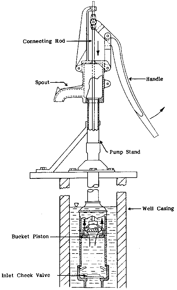 (a) The single-acting cylindrical piston pump is most frequently used in wind-powered pumping systems. It consists of a cylinder with an inlet pipe and valve at the base, a leather-sealed piston with a one-way valve and a water outlet at the top, water passing through the pump only on the lifting stroked of the piston. This type of pump is used to pump water from any depth, with an operating speed of up to 40 strokes per minute.