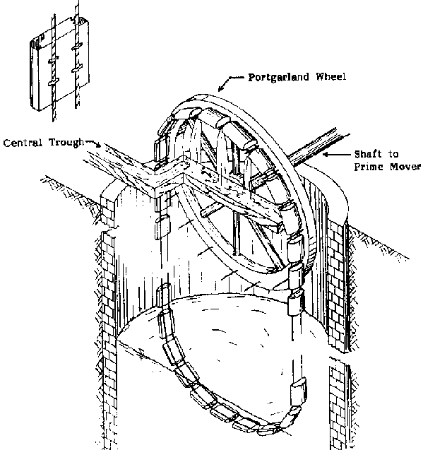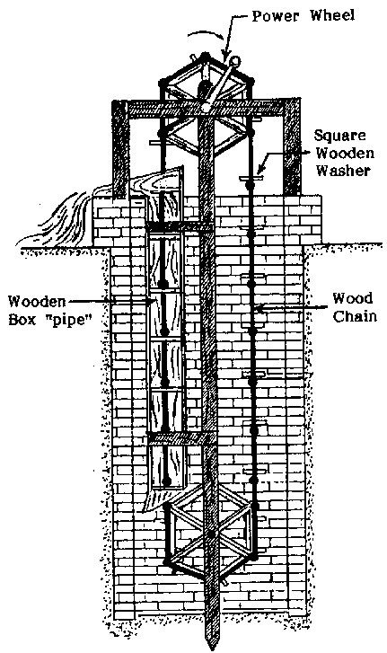 (b) The round-steel-washer chain pump (figure 6) is used in conjunction with human and animal power and consists of a continuous steel chain upon which are mounted steel discs with rubber or leather washers. The chain passes around an upper gear wheel, down the well, under the water source, around and then up into the bottom of a pipe with inner diameter the same as the washers. Water is lifted up within the pipe and expelled at the top. A square wooden adaptation of this pump is shown in figure 7.