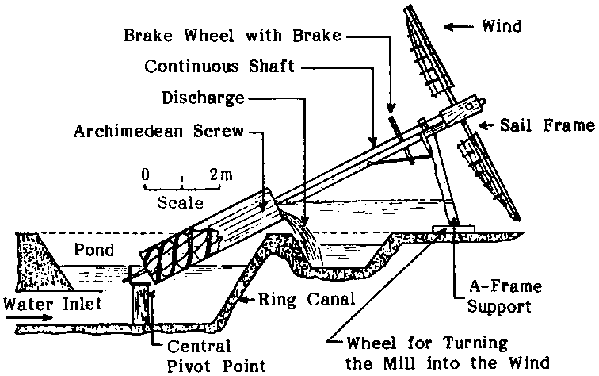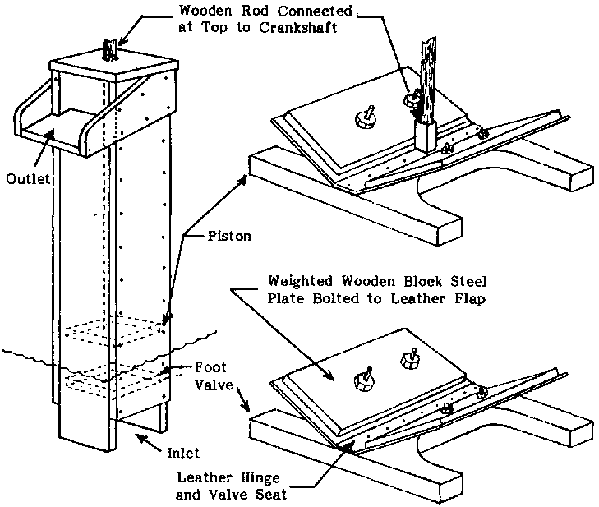 (b) A square wooden single-acting piston pump is commonly used by fishermen in eastern Canada (figure 3) and has recently been adapted to wind power. A square wooden pump powered by the wind has been powered for use in Thailand. The height of lift is limited by the amount of water pressure that can be sustained by the wooden joints, although the simple construction is well adapted to basic carpentering skills.