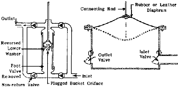 (d) The diaphragm pump (figure 4) consists of a cylinder closed tat the lower end, with a circular diaphragm of rubber or some other material fixed at the top end. A reciprocating connecting rod is fixed to the center of the diaphragm and, upon vertical movement causes volumetric displacement in the cylinder. An arrangement of valves allows water movement in only one direction through the cylinder. The difficulty with this pump is the high rate of wear on the diaphragm at its connection with the cylinder and connecting rod. A diaphragm pump has been developed for use with a Savonius rotor.