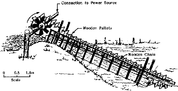 (a) The square-wooden-pallet chain pump (figure 5) is commonly used in China and southeast Asia for lifts up to 3m and consists of rectangular wooden pallets or paddles mounted on a continuous wooden chain that runs up an inclined square-section open wooden trough. The paddles and chain pass around a large wooden driving gear wheel at the top and around a small passive gear wheel at the base of the trough which is submerged in water. This type of pump is commonly used with Chinese vertical-axis wind pumping systems and with Thai high-speed wooden rotors and Thai sail rotors.