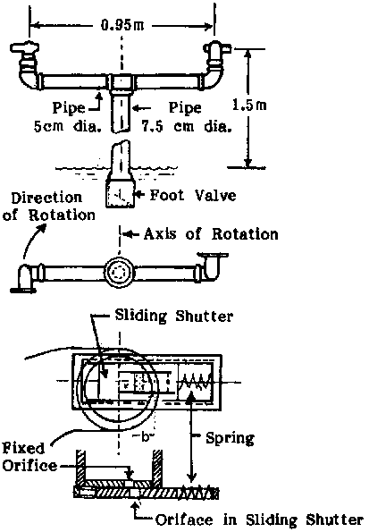 Another type of centrifugal pump is the centrifugal reaction pump (figure 9) which consists of a vertical pipe with a T-joint at the top, from which extent two pipes whose length is dependent upon the rate of rotation of the assembly in operation. An orifice at the end of each pipe arm points 90° away from the arm. When the assembly is filled with water and rotated in the direction opposite to the orifices, the water is forced out through the orifices by centrifugal force and replenished by water coming up through a valve in the bottom of the vertical pipe. This pump is well adapted to variable low speeds, and construction is simple. One of these pumps, connected to a 3m diameter high-speed wind rotor, pumped 30 m³ per hour at a head of 4.5m in a 29 km/in wind.