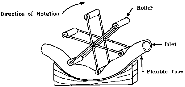 (f) The peristaltic pump (figure 11) consists of a flexible hose with a series of rollers along the length of the hose in order to squeeze water through the hose. The type of pump has reportedly been adapted to a Greek sail wind rotor at the Malaysian Agricultural Research and Development Institute.