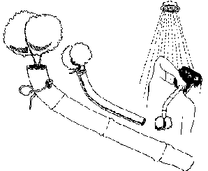 A bathing sponge on a plastic or bamboo stick can be used to wash one's back when one is unable to reach it because of restricted mobility. Use an electricity pipe or bamboo stick that has been bent by careful heating and glue the sponge onto it. It is even more convenient to use a bent stick with a small hole in it, so that a rope can be used to attach the sponge. In that case the sponge can be replaced easily when spoilt.