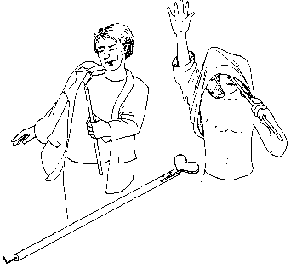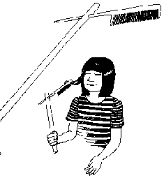 People in wheelchairs, or people who have trouble bending down can pick up things from the floor with a 'helping hand'. It is made of a piece of bamboo. Carve a groove at both ends of the bamboo. Put a piece of wood in one groove to serve as a wedge and fix it with rope or rubber bands. When you press the bamboo lightly at the sides, it works like a pair of pincers.
