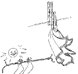 It is hard to hang out laundry with one hand. This activity can be made easier by fixing two clothes-pegs onto each other. Put the laundry on the first peg, then peg the second one to the clothesline. It is also possible to make a double, loosely twisted clothesline. The clothes can be put up between both lines without having to use clothes pegs at all.