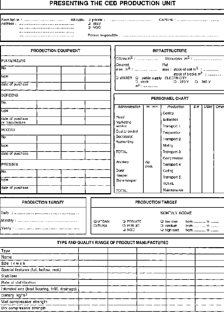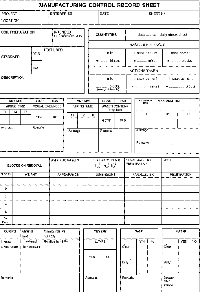 The product block control record sheet (see below) is used for a final check of the products obtained after processing, i.e. the compressed earth blocks.